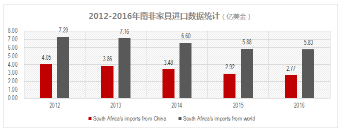2016年南非家具總進(jìn)口額高達(dá)5.83億美元自中國(guó)進(jìn)口2.77億美元,占比47.51%。