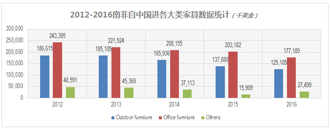 2016年南非自中國(guó)戶(hù)外家具金額高達(dá)1.25億美金,辦公家具進(jìn)口額為1.77億美金,其他家具及零部件274萬(wàn)美金。