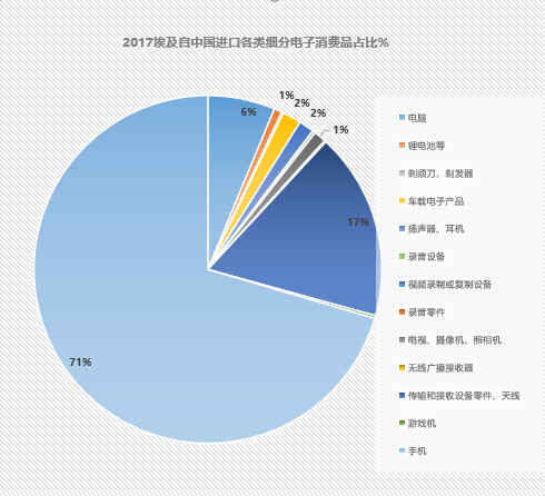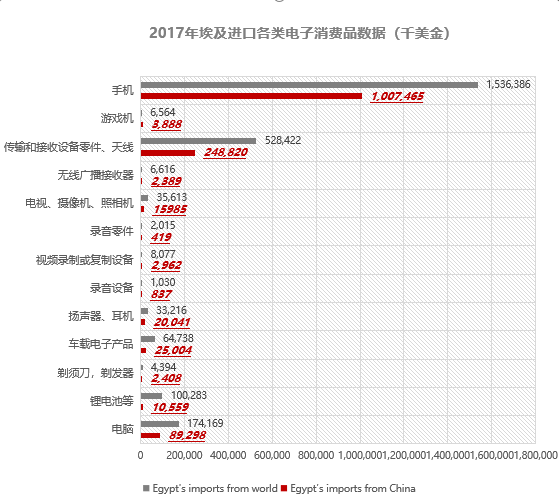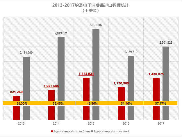 2017年埃及電子消費品進口量達25.01億美元。其中自中國進口14.30億美元,占比57.17%。近五年,埃及自中國進口家電增長了74.2%,中國電子消費品制造受到埃及人民歡迎。