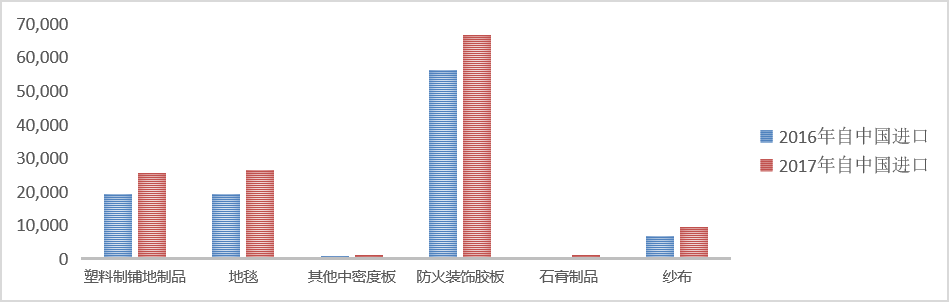 2017年,巴西從中國(guó)進(jìn)口的地鋪材料中,地毯占比最大,達(dá)到了35.5%,同比2016年增長(zhǎng)36.7%;其次為塑料制鋪地制品,占比達(dá)34.5%,同比2016年增長(zhǎng)32.9%。