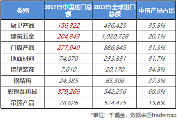設(shè)備五金:2017年巴西自中國(guó)進(jìn)口的彩鋼瓦機(jī)械占其全球進(jìn)口的69.9%,達(dá)3.79億美元。從中國(guó)進(jìn)口建筑五金類產(chǎn)品同比增幅19.3%,達(dá)2.05億美元。水龍頭、閥門、球閥、銘牌、賤金屬鎖等產(chǎn)品均有大幅增長(zhǎng)。