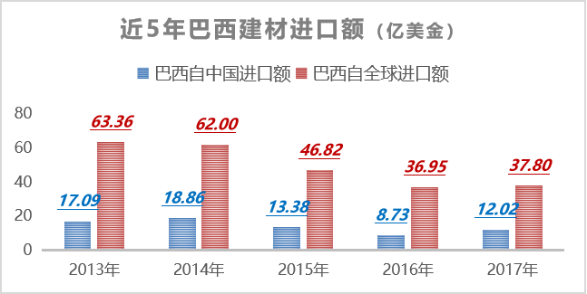 2017年巴西建材產(chǎn)品總進(jìn)口額達(dá)37.8億美元;其中自中國(guó)進(jìn)口相關(guān)產(chǎn)品達(dá)12.02億美元,占巴西同類產(chǎn)品總進(jìn)口額的31.8%。從海關(guān)數(shù)據(jù)可以看出:2017年巴西建材產(chǎn)品全球需求正緩慢復(fù)蘇,較2016年增長(zhǎng)2.3%。而從中國(guó)進(jìn)口的建材產(chǎn)品也在逐漸增加,同比增幅明顯,高達(dá)37.7%。