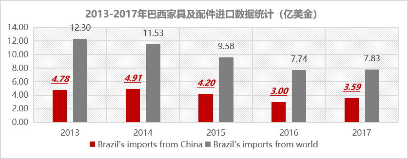 2017年巴西全球家具進(jìn)口額達(dá)7.83億美元。其中自中國(guó)進(jìn)口的家具占45.85%,約3.59億美元。