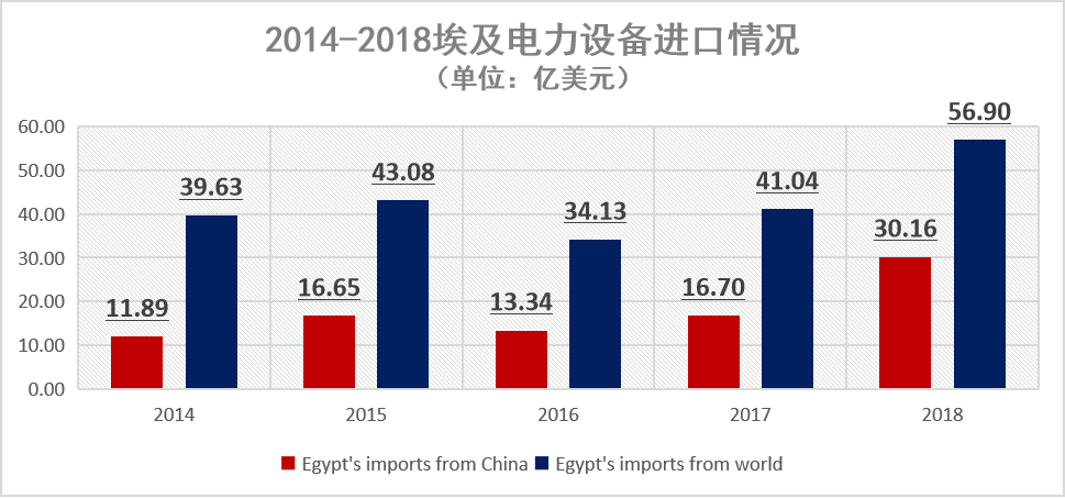 2018年中國電力設(shè)備在埃及市場占比創(chuàng)5年來的新高,占比達53.01%,較2014年增長了70.7%。目前中國已成為埃及主要電力設(shè)備的第一進口來源國。中國電力產(chǎn)品在價格和功能上也更適應(yīng)埃及目前的國情。