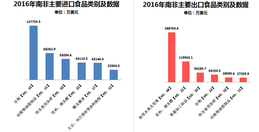 據(jù)聯(lián)合國商品貿(mào)易數(shù)據(jù)庫統(tǒng)計,2016年南非食品貿(mào)易額達到140.6億美元,同比2015年(123.3億美元)增長14.1%。其中食品進口額為59.4億美元,同比增長27.9%;而食品出口額高達81.2億美元,同比增長5.7%。